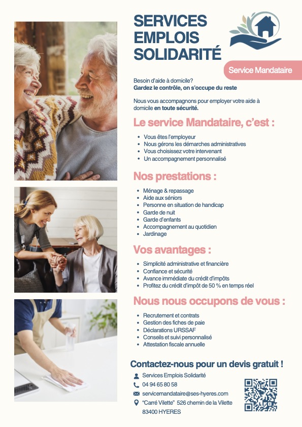 Avec 32 ans d’expérience l’association Services Emplois Solidarité, fondée en 1992 à Hyères, offre des services d’aide et de maintien à domicile, en mode mandataire et prestataire. Elle a obtenu le Label Qualité en 2007 et la Certification NF Services aux Personnes à domicile en 2011.